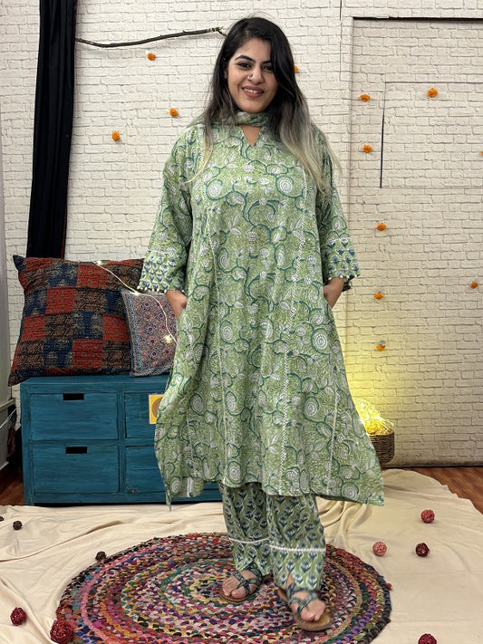 Kaner Hand Block Printed Suit Set with Lace Detailing