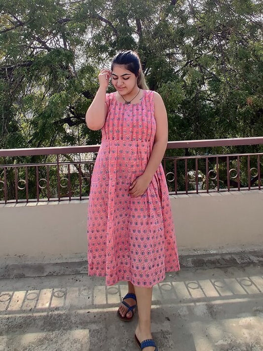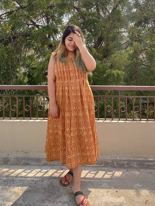 Tanika Hand Block Printed Sleeveless Dress with Box Pleats