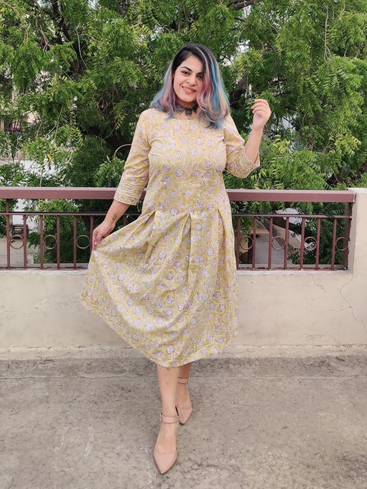 Green Floral Hand Block Printed Side Slit Dress with Pocket