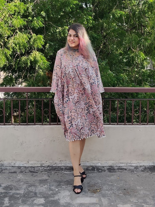 Brown Floral Hand Block Printed Comfort Fit Flared Dress with Pompoms