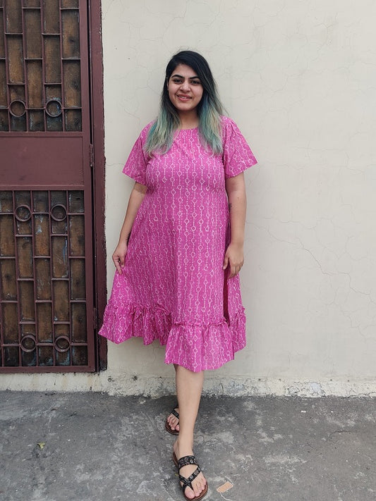 Raspberry Hand Block Printed Shift Dress with Tier and Gathered Sleeves