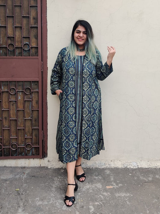 Aasmi Ajrakh Sleeveless Dress with Cape and Lace Detailing
