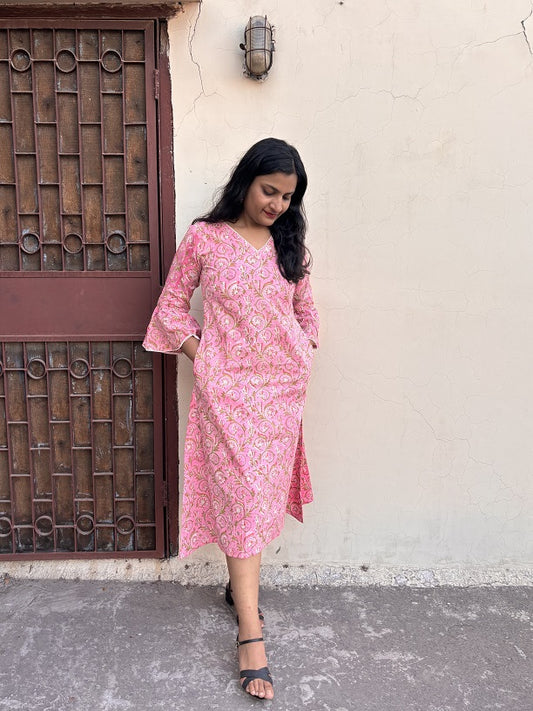 Pink Peonies Hand Block Printed Asymmetrical Dress with Side Slit