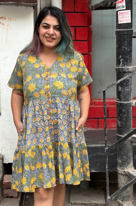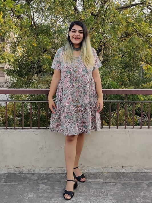 Camellia Hand Block Printed Knee Length Tiered Button Down Dress
