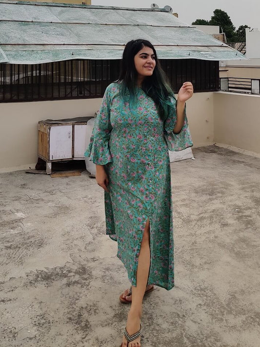 Sale 34% OFFTeal Blue Hand Block Printed A Line Maxi Shirt Dress