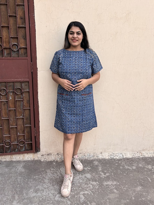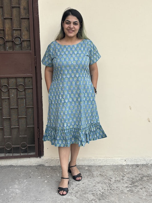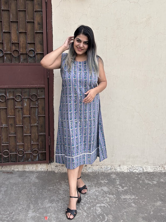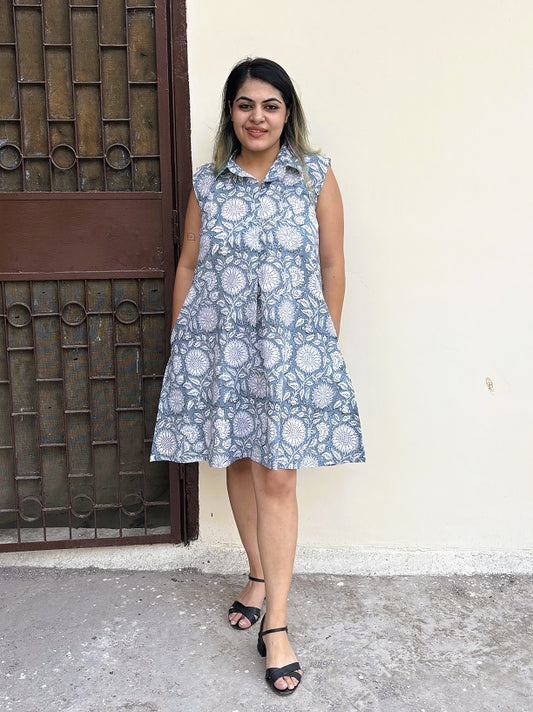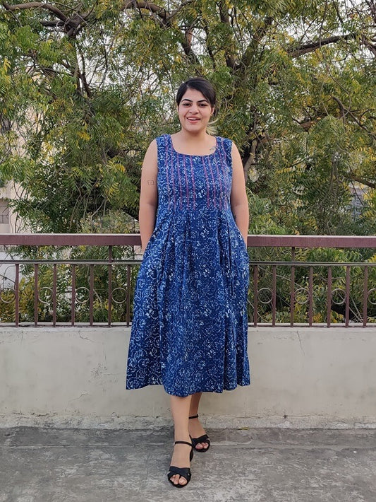 Blueberry Hand Block Printed Sleeveless Dress with Box Pleats