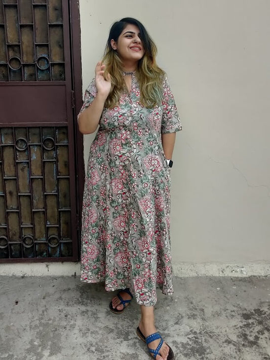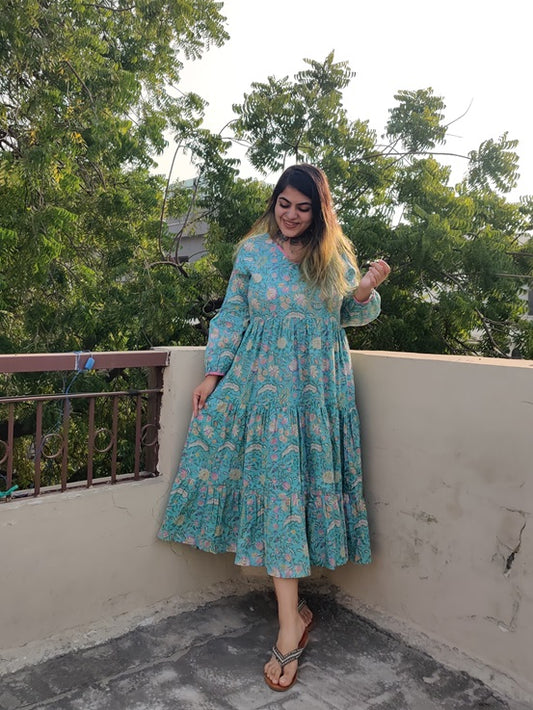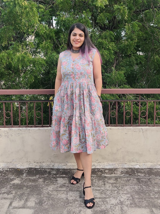 Cherry Blossom Hand Block printed Tier Dress with Pintuck Sleeve Detailing