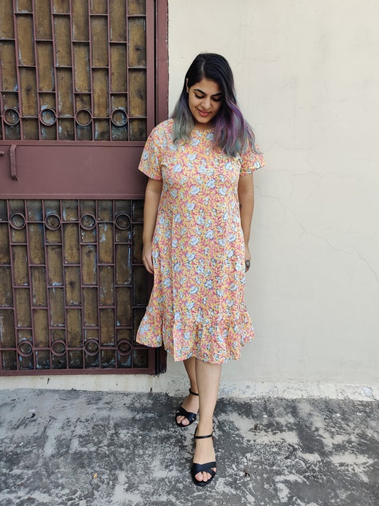 Floral Fizz Hand Block Printed Shift Dress with Tier and Gathered Sleeves