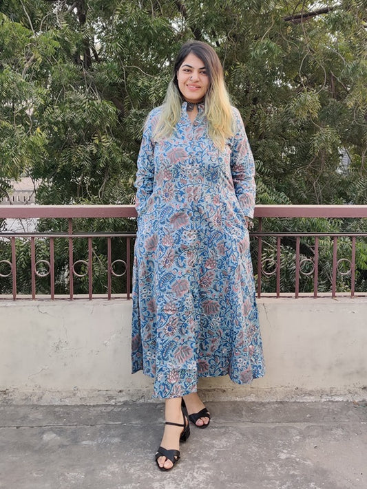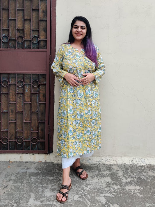 Yellow Blue Floral Hand Block Printed Cotton Long Kurta