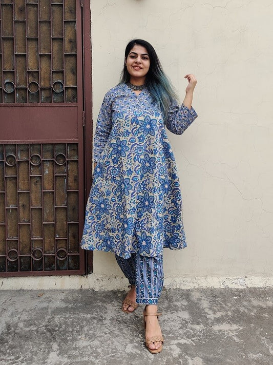 Aahna Hand Block Printed Cotton Kurta Set with Afghani Pants