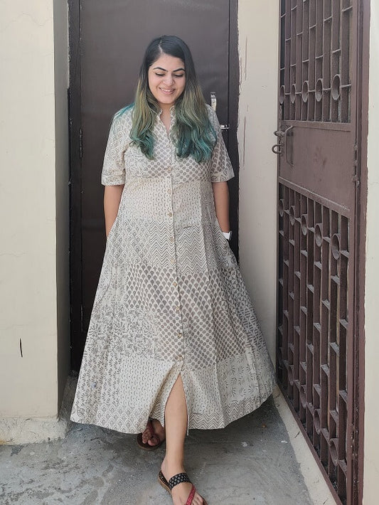 Abani Hand Block Printed Knee Length Tiered Button Down Dress