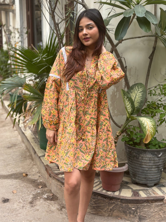 Salmon Tiered Short Dress with Lace Detailing and Collar