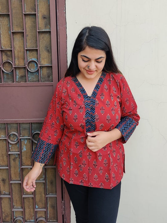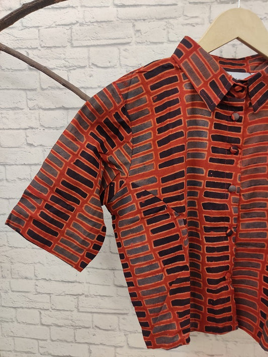 Red Boxes Ajrakh Hand Block Printed Crop Top Shirt Blouse
