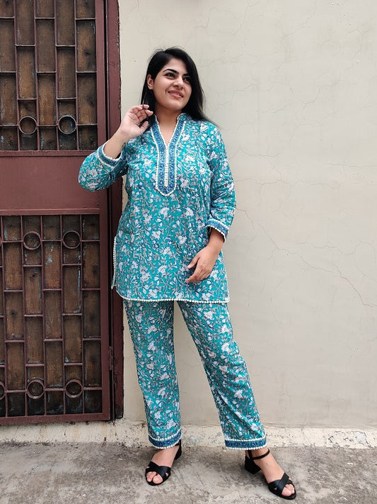 Green Blue Hand Block Printed Short Kurti Coordinated Set with Lace Detailing