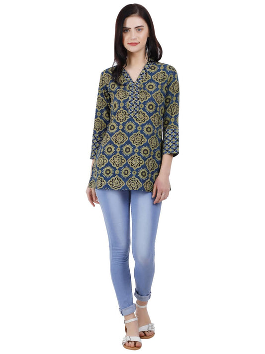 Sale 46% OFFIndigo Green Ajrakh Dual Fabric Cotton Short Kurti