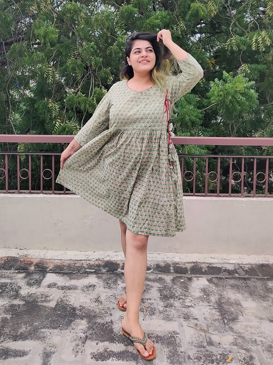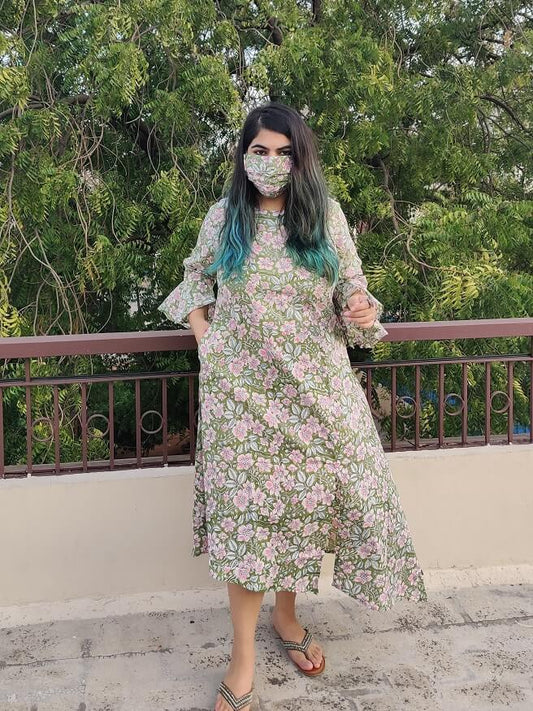 Green Floral Hand Block Printed Side Slit Dress with Pocket