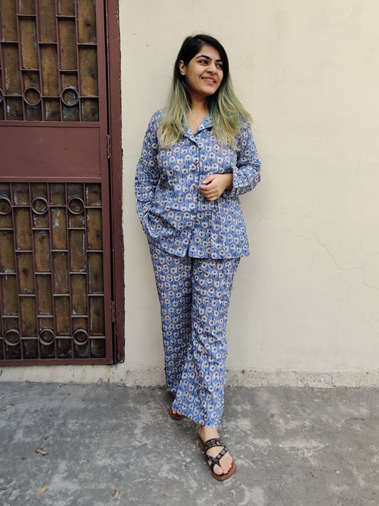 Bluish Grey Yellow Floral Hand Block Printed Cotton Lounge Wear Coord Set