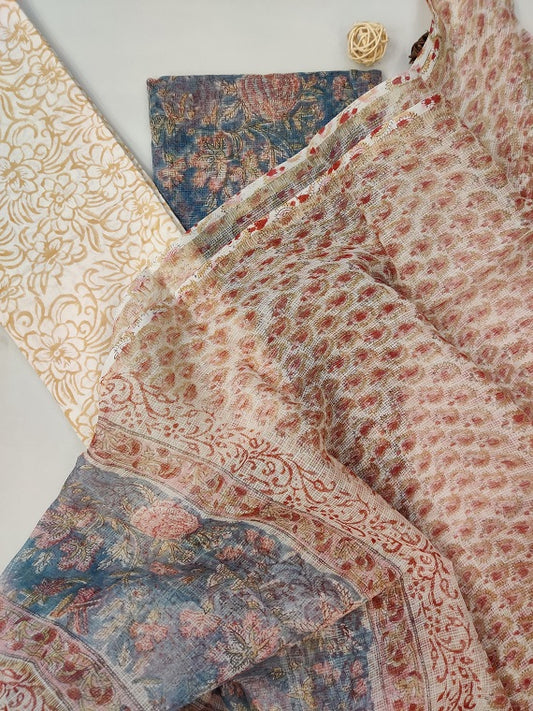 Blue Red Floral Hand Block Printed Kota Suit Set