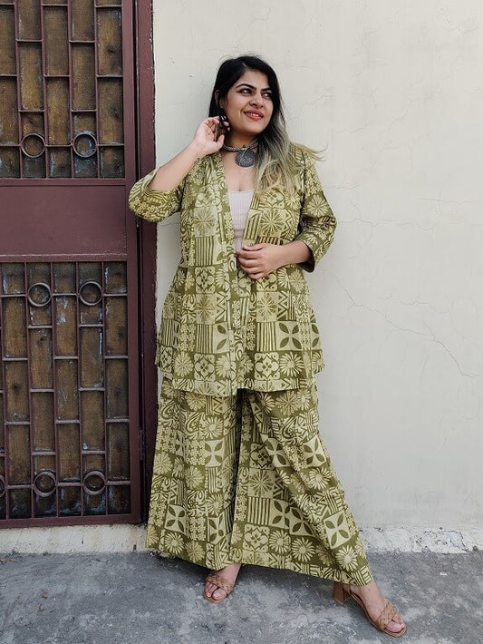 Olive Hand Block Printed Culottes and Shrug Coordinated Set