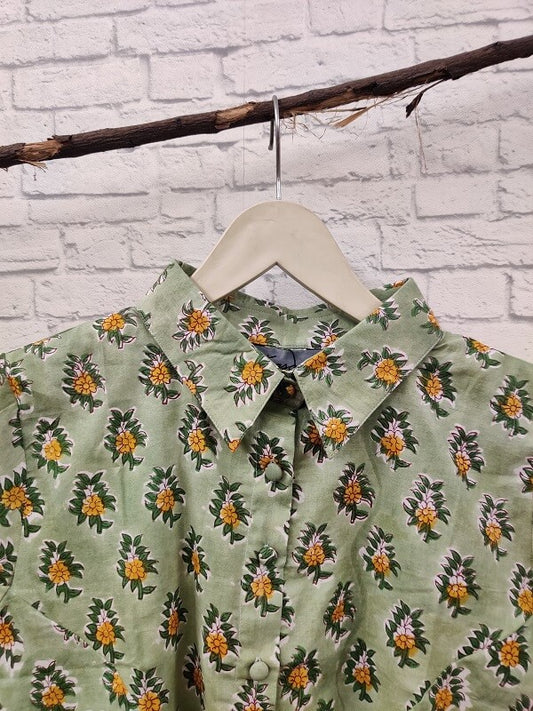 Green Yellow Floral Hand Block Printed Crop Top Shirt Blouse