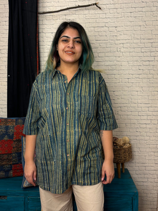 Indigo Green Lines Ajrakh Hand Block Printed Half Sleeves Unisex Shirt
