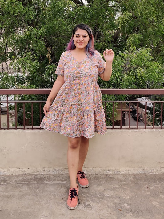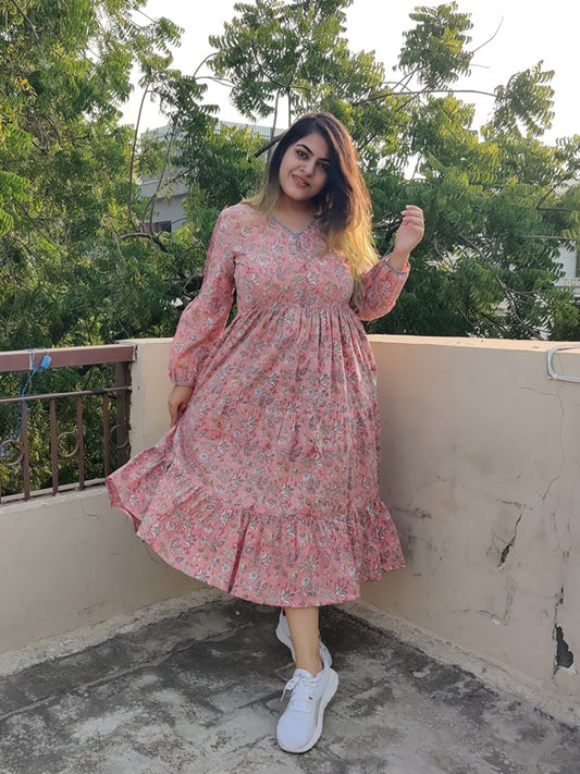 Peach Blossom Hand Block printed Tier Dress with Pintuck Sleeve Detailing