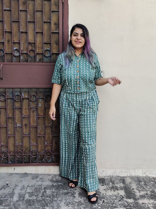 Teal Hand Block Printed Coordinated Set with Shirt and Flared Pants