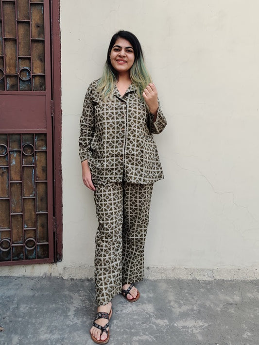 Olive Green Geometric Hand Block Printed Cotton Lounge Wear Coord Set