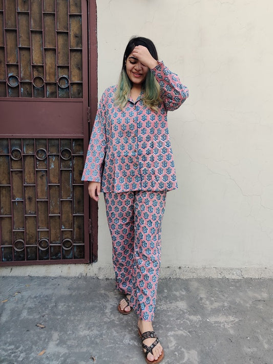 Peach Teal Floral Hand Block Printed Cotton Lounge Wear Coord Set
