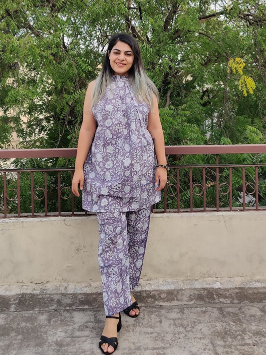 Purple Floral Hand Block Printed Halter Neck Coordinated Set