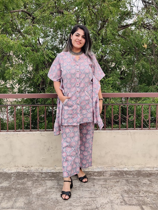 Grey Pink Hand Block Printed Shirt Kaftan Coordinated Set