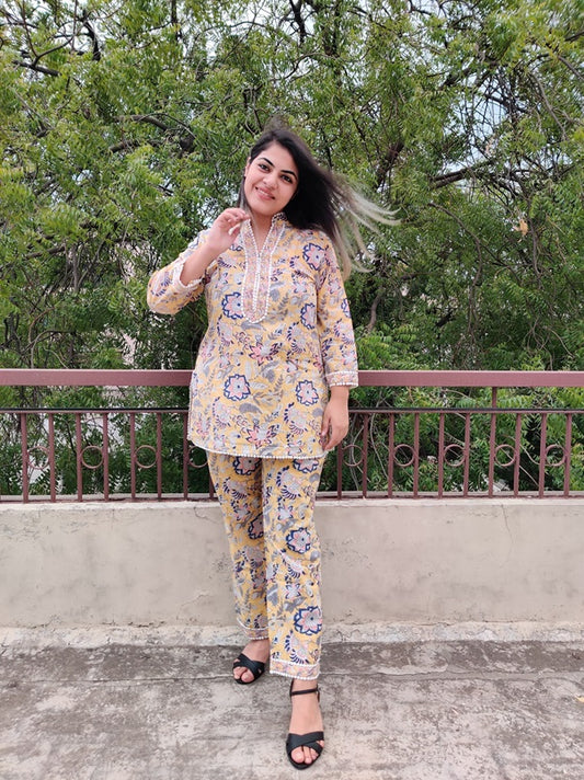 Yellow Peach Hand Block Printed Short Kurti Coordinated Set with Lace Detailing