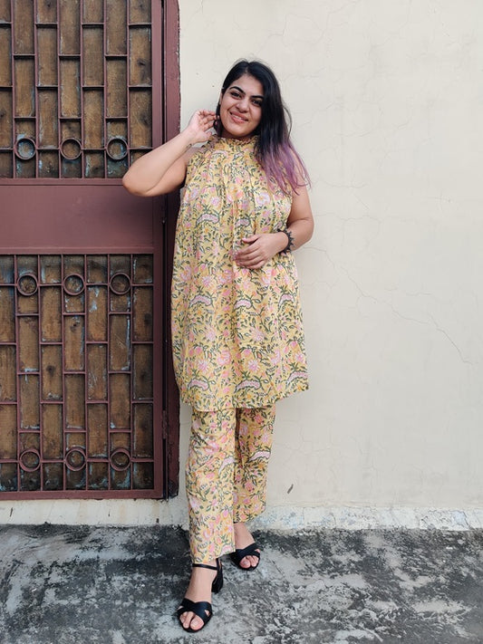 Yellow Floral Hand Block Printed Halter Neck Coordinated Set
