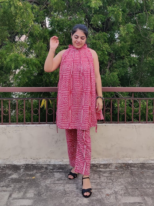 Pink Dabu Hand Block Printed Halter Neck Coordinated Set