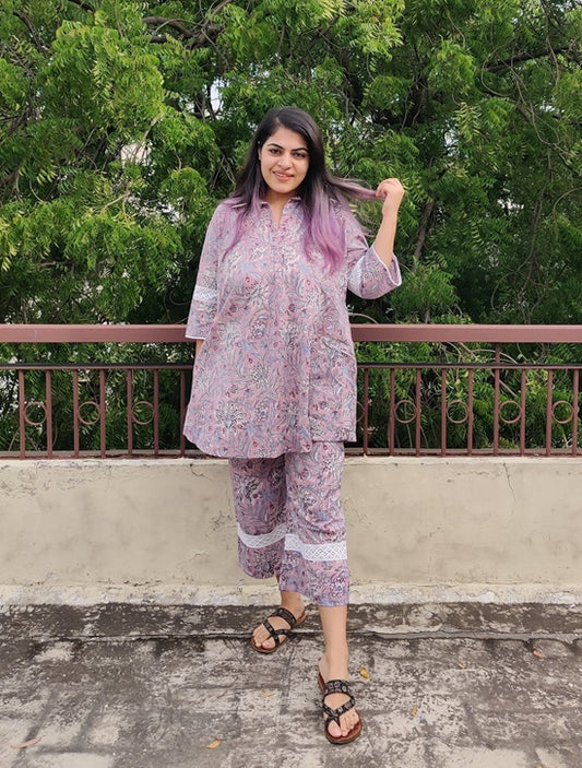 Lavender Hand Block Printed Comfort Fit Coordinated Set with Lace Detailing
