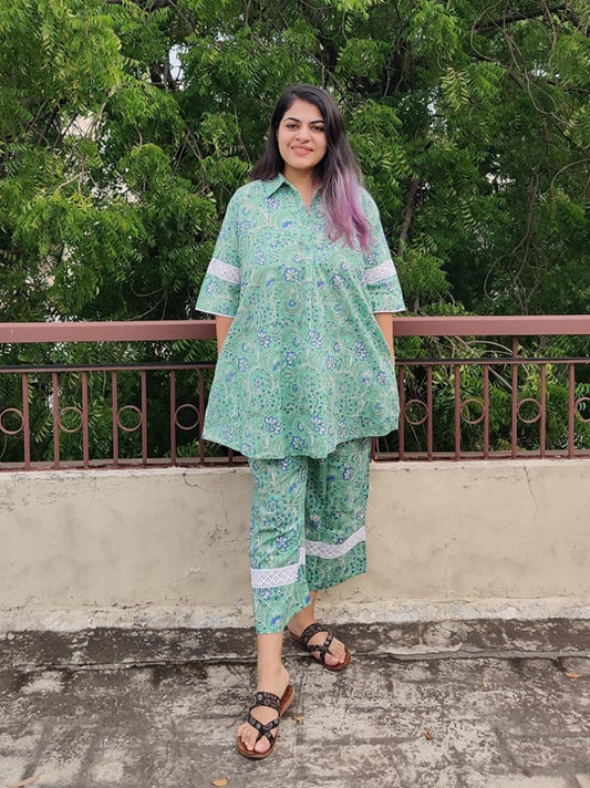 Green Blue Hand Block Printed Comfort Fit Coordinated Set with Lace Detailing