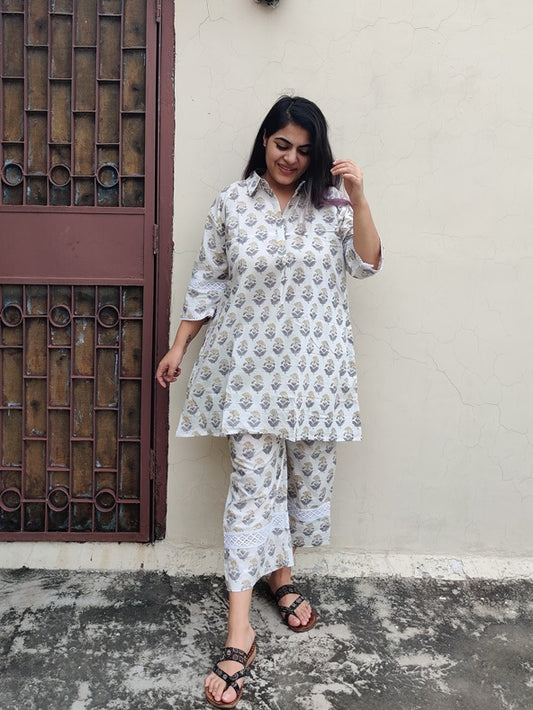 White Grey Hand Block Printed Comfort Fit Coordinated Set with Lace Detailing