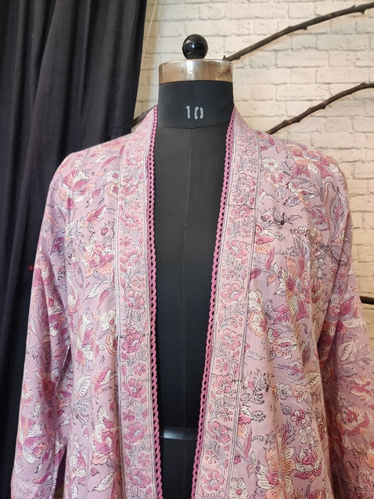 Purple Floral Hand Block Printed Shrug Overlay with Lace Detailing