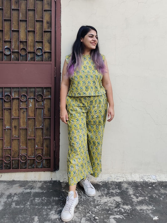 Yellow Hand Block Printed Coordinated Set with Sleeves Top and Plazzo Pants