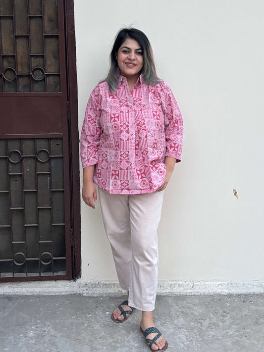 Pink Tiles Hand Block Printed Front Tie Top with Sleeves