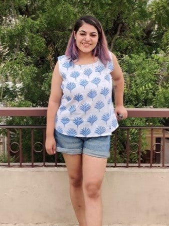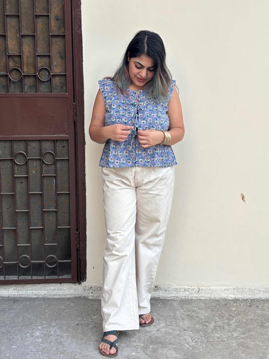 Blue Glow Hand Block Printed Sleeveless Top with Pintuck