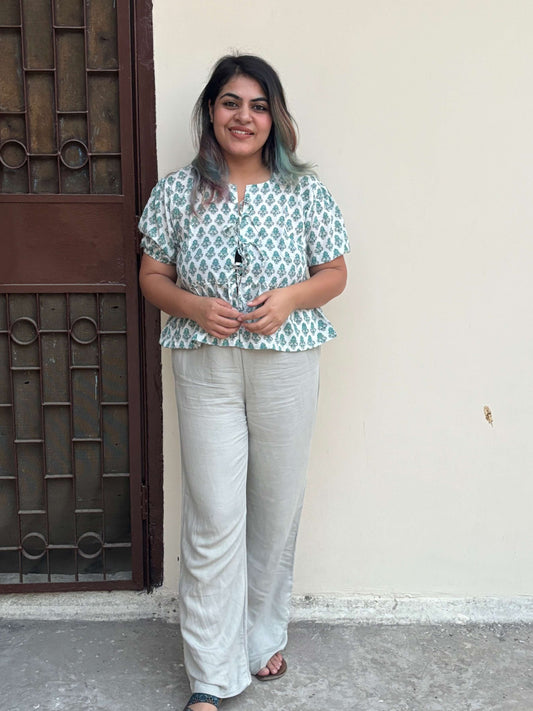 White Green Hand Block Printed Front Tie Top with Sleeves