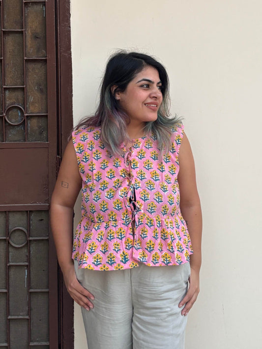 Pink Yellow Hand Block Printed Front Tie Sleeveless Top