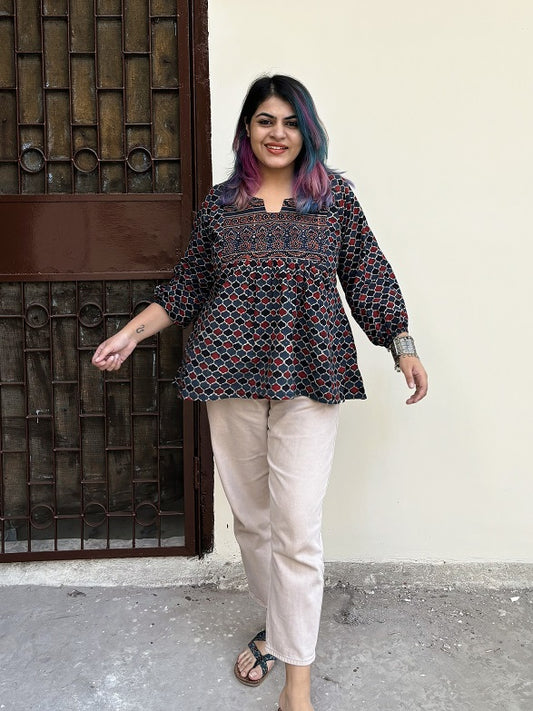 Indigo Red Ajrakh Boho Top with Back Drawstring