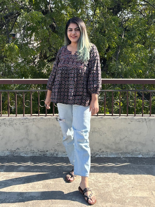 Black Ajrakh Boho Top with Back Drawstring