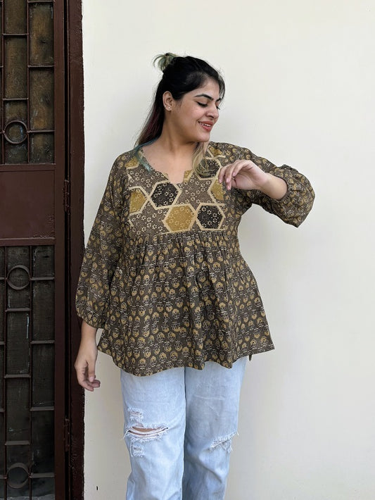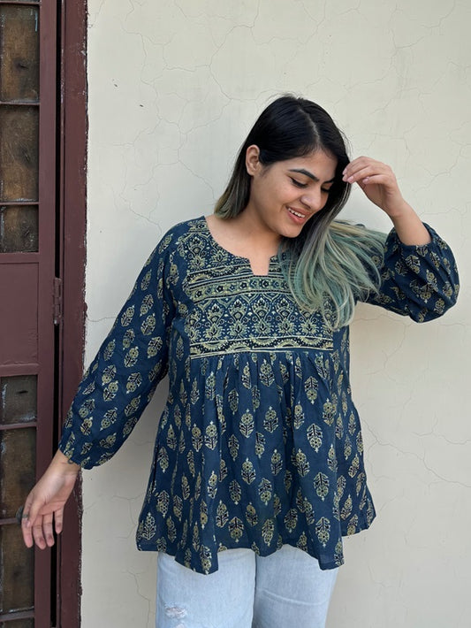 Indigo Green Ajrakh Boho Top with Back Drawstring