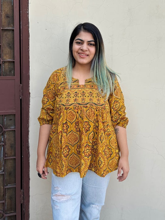Orange Yellow Hand Block Printed A Line Relaxed Fit Collar Top