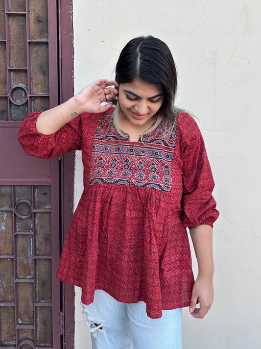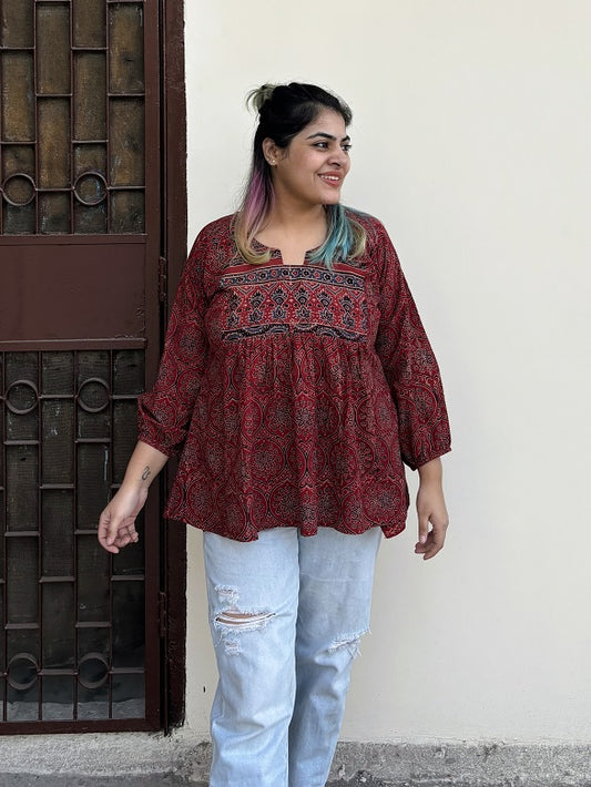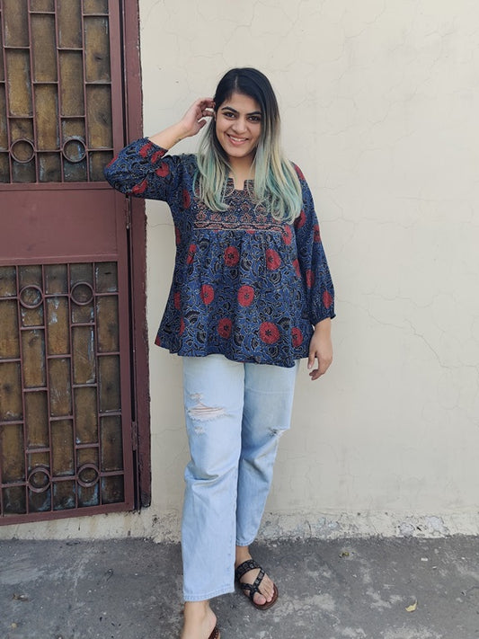 Indigo Red Ajrakh Boho Top with Back Drawstring
