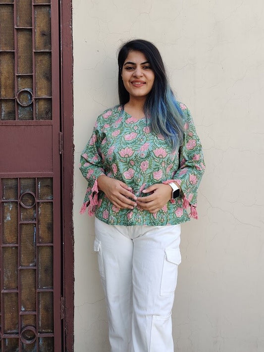 Cherry Lotus Handblock Printed Top with Bell Sleeves and Tassels