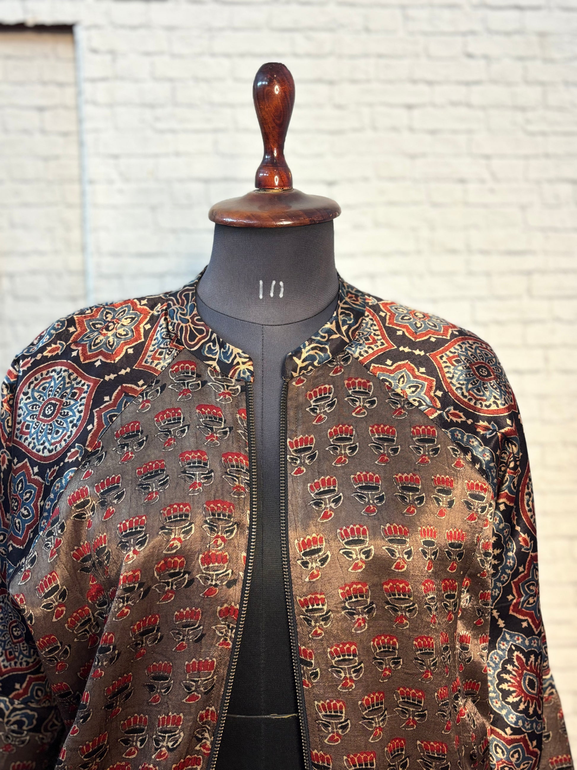 Brown Red Mashru Silk Ajrakh Unisex Bomber Jacket